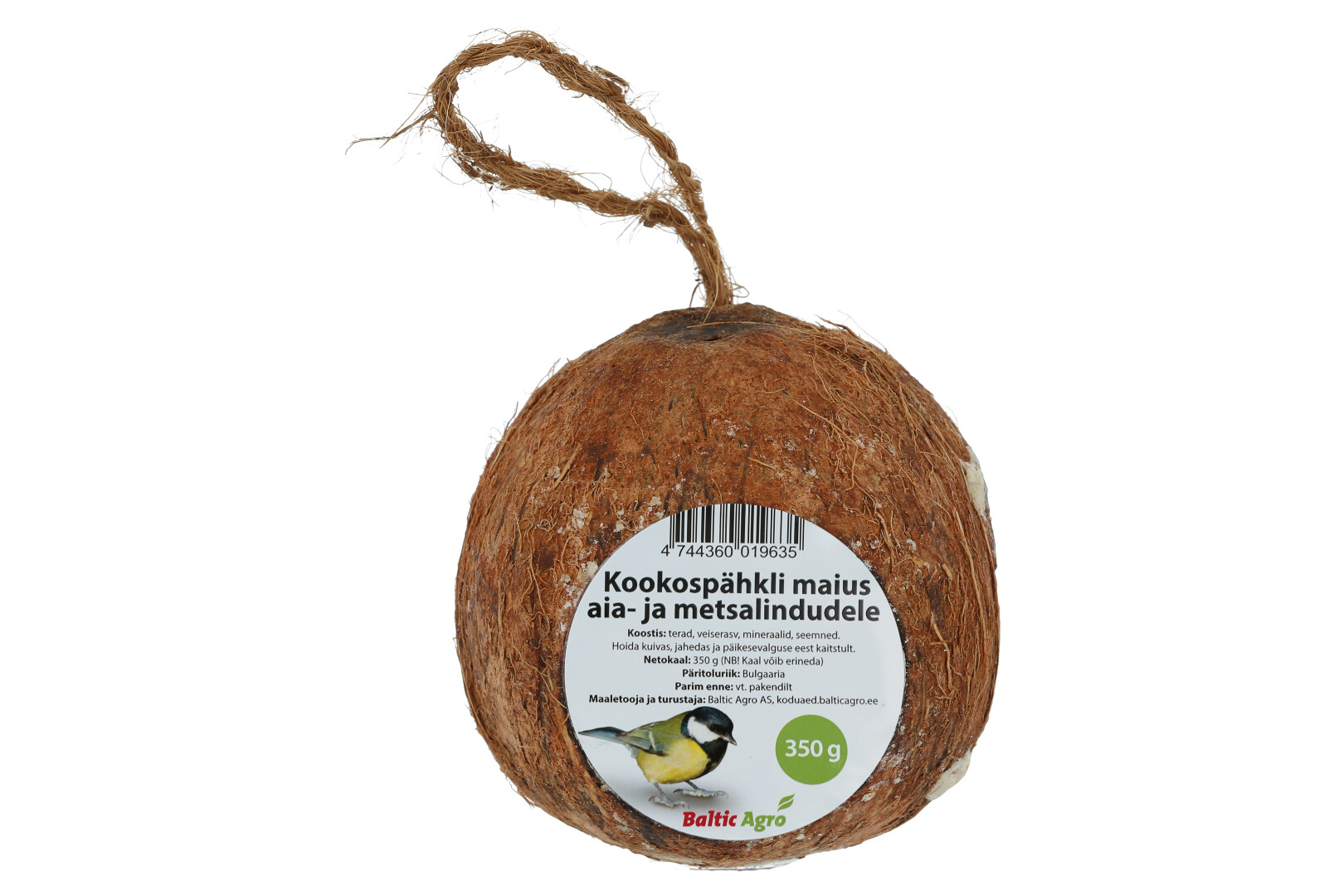 Eemaldage kile ja riputage toode loodusliku kookoskiust nööri abil oksa külge. NB! Kui oled juba lindude toitmisega alustanud, jätka seda kindlasti kevadeni, sest lisatoitmisega harjunud linnud võivad toidu puudumisel hukkuda.
