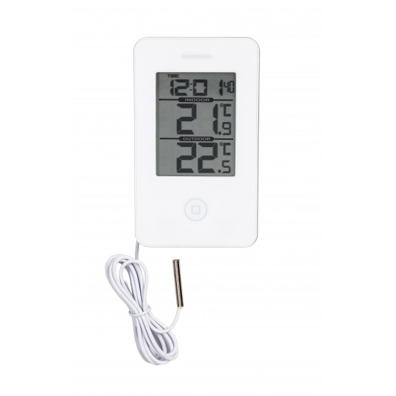 Digitaalne termomeeter sise ja välis,kellaga, valge.